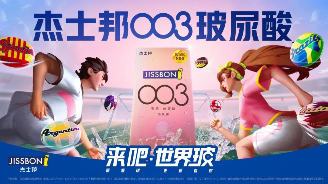 此次营销战役选取更贴近女性向的003玻尿酸系列,延续品牌在2018年俄罗斯世界杯期间的“爱看球,更爱看你”的slogan,既有体育赛事的热血,又兼顾了情侣间的亲密需求,同时紧扣杰士邦在体育营销中的“国际知名运动防护品牌”定位,将赛事精神与品牌价值很好地融合,给人留下深刻的印象。
