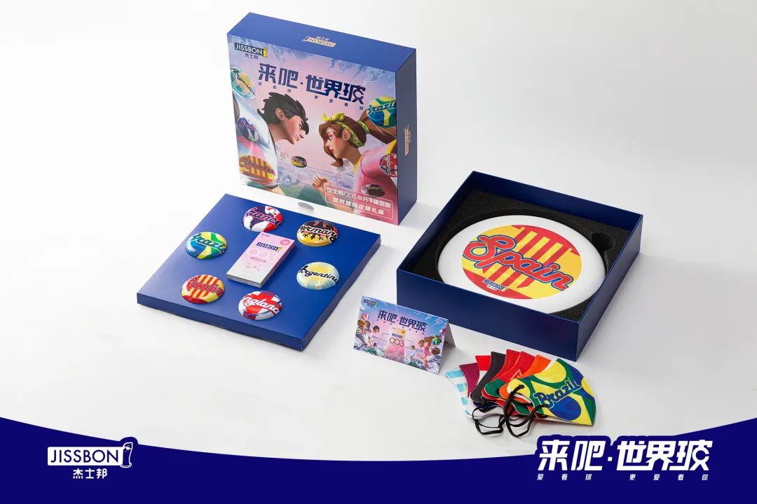 除了氛围感十足的“世界玻”TVC,杰士邦还定制了大量“世界玻”主题的礼盒及周边商品。两款礼盒内容略有不同,其中一款含有双11刚上市的003小分子玻尿酸新品,6个主流强队国家队定制小铁盒,还有9个国家队盲盒,以及9个定制国家队飞盘、口罩、手机支架、抱枕,以及杰士邦×虎扑联名世界玻足球等等,真是面面俱到,无论是窝在家享受亲密时光还是出门挥洒汗水,都能用得着。