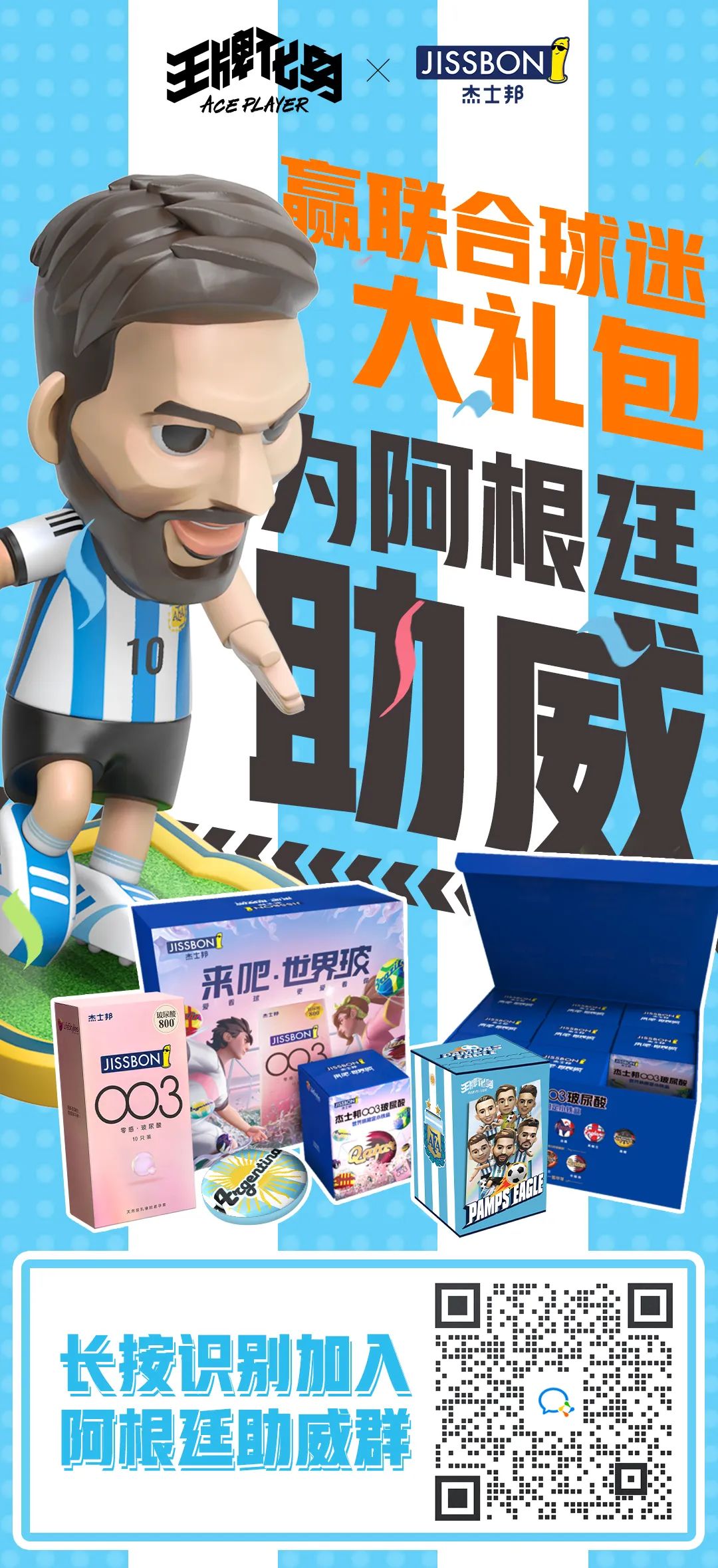 而且,杰士邦这次还尝试和顶级的潮玩制造商《王牌化身》,开启阿根廷国家队主题的联合营销活动,在赢联合球迷大礼包中加入球员手办,在球迷群体中进一步细分出手办爱好者群体,或许能为下一次赛事营销,打开新思路。