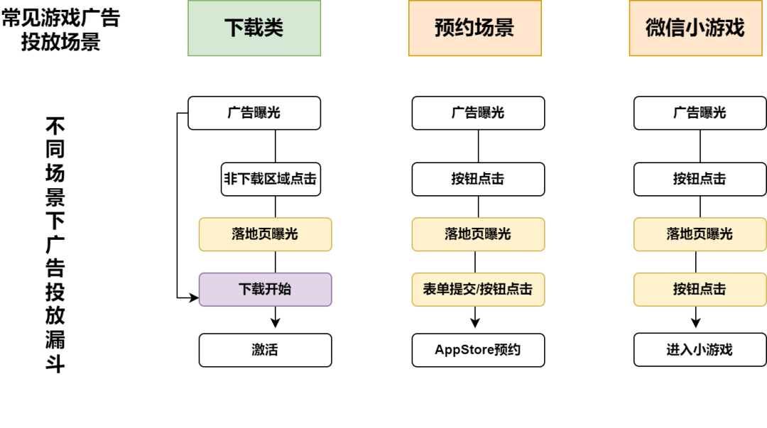 同时,游戏广告不仅仅都是下载类的产品,同时会包含到【预约、小游戏】这两种场景,在广告链路上往往是【广告曝光——按钮点击——落地页打开——落地页按钮点击/表单提交——后续行为】,我们能够看到,落地页是这两种场景中广告漏斗的一个重要环节,因此落地页是提升广告转化率的重要环节;
