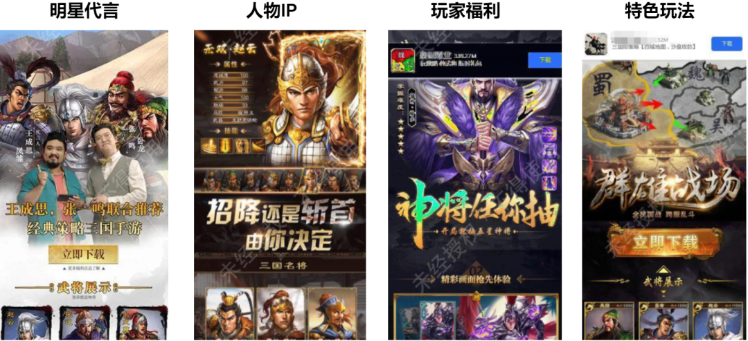 如卡三国题材游戏中的特色玩法、大IP人物角色、代言人、用户评分、玩家福利等,均可作为落地页核心内容进行展开设计!