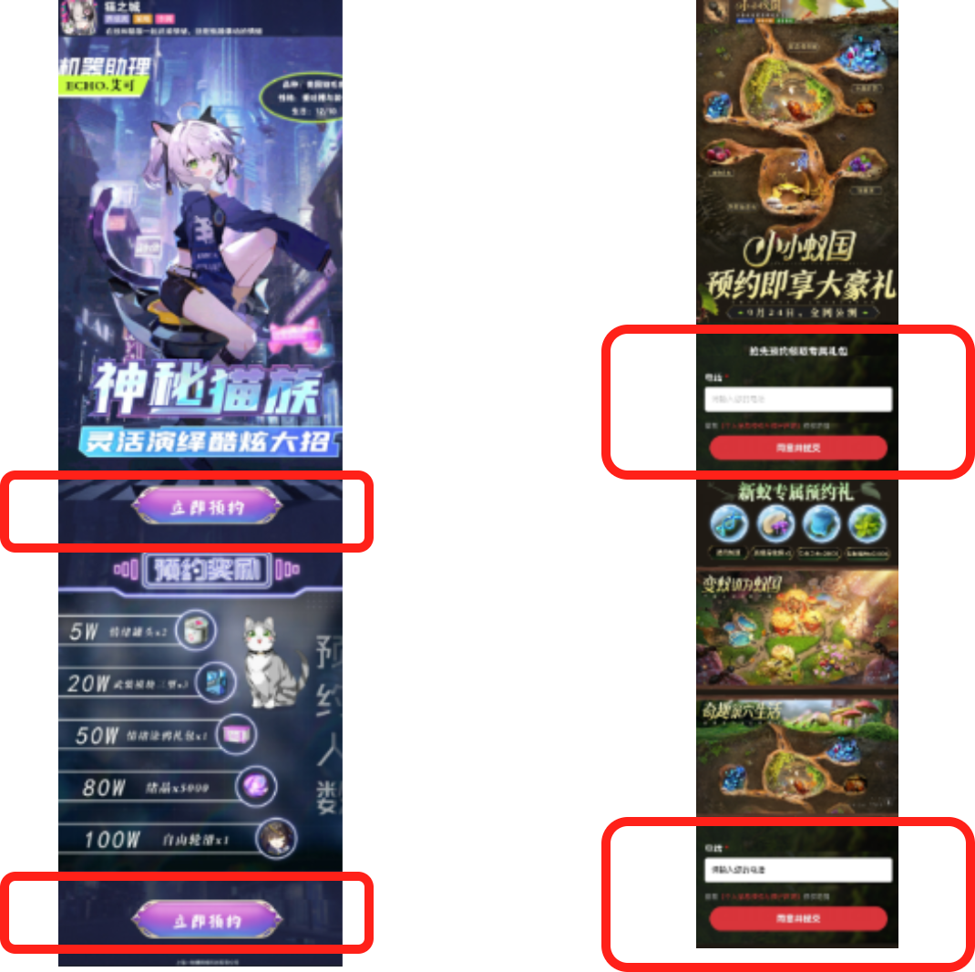 在新游预约期,若是表单形式进行投放,建议在第一屏与结尾均增加表单预约填写,提升用户填写表单便捷性与突出性,提升用户转化效率,降低用户操作成本。若为表单按钮形式进行投放,可在落地页中首屏、下部按钮固定悬浮、以及福利领取时均增加转化按钮。