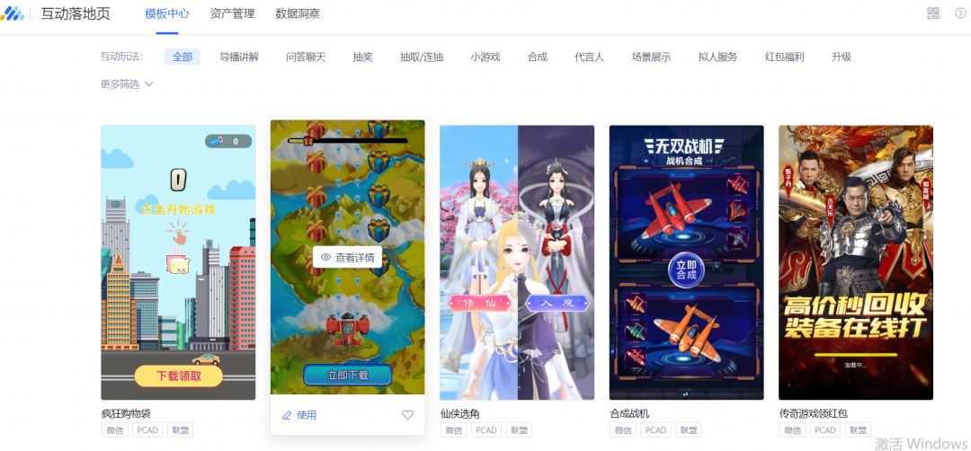 为了提升落地页的趣味性和互动性,广告主还可直接通过互动蹊径落地页选择已有的模板制作试玩、轻互动等样式,制作方便快捷,同时也能达到不错的效果;若有技术能力的还可通过【自制互动H5-JSSDK接入】,将游戏精彩内容进行承接,使得用户无需下载即可试玩,以提升长效转化。
