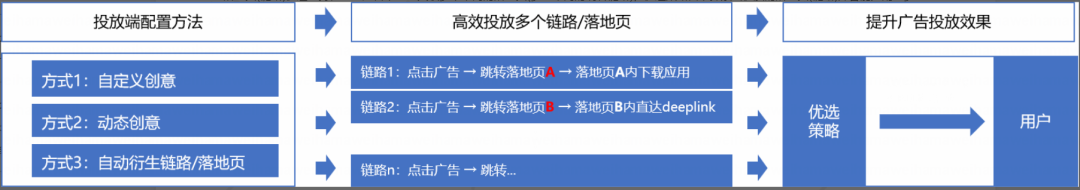 因此在面对设计出来的多落地页,建议交给平台,通过智能化组合,让系统来选择合适的落地页,让转化率高的落地页多消耗,转化率的落地页减少链路,以此以提升广告转化率和投放效率。
