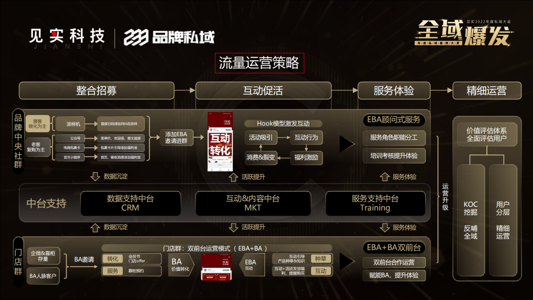 然后在互动过程中,我们会提供整个环环相扣的Hook模型,去激励和吸引用户。在这套体系背后,我们有EBA和BA双前台配合的服务体验,会有对EBA的培训、赋能等,帮助EBA解决很多问题。在整个招募促活服务背后,我们会有精细化运营和用户评估分层体系,会进行KOC的挖掘等。