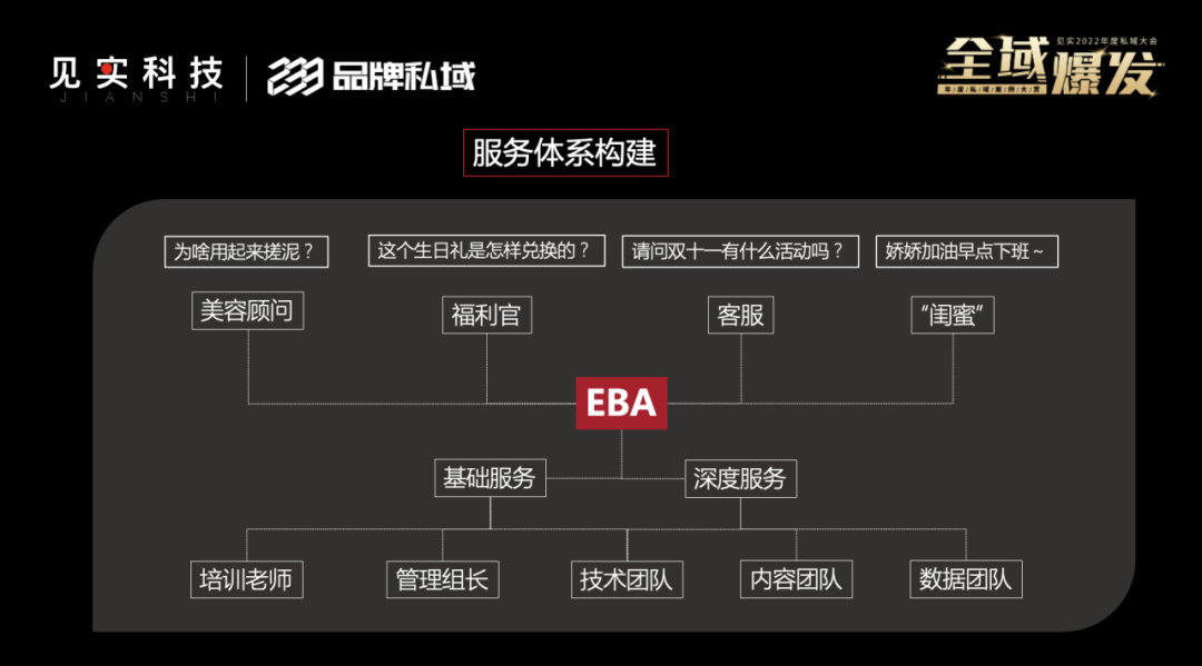所以一个EBA可能会有这4种身份,我们认为这背后应该由不同角色的人去完成,会有不同的任务体系。包括做基础服务的人员,他可能是福利官、客服。也包括叫做深度服务的人员,他可能是美容顾问和闺蜜这样的角色。