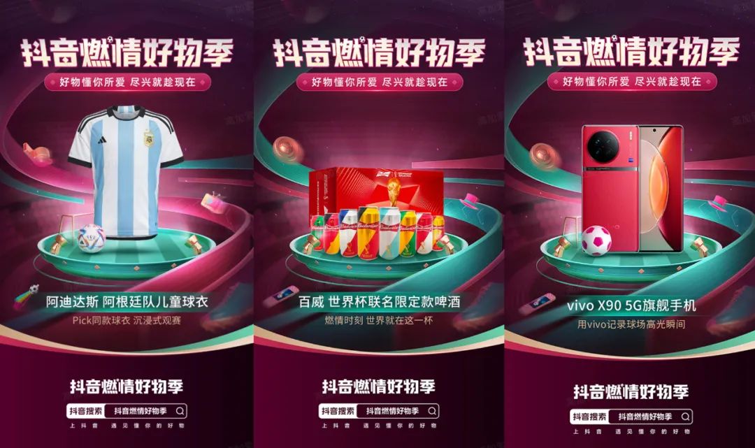 在热点内容为活动打造吸睛亮点,实现全域引流的同时,抖音电商更在推动转化的路上,聚焦人们在“世界杯消费”这个特殊消费场景的兴趣特点,为品牌、好物们添加了多重BUFF。