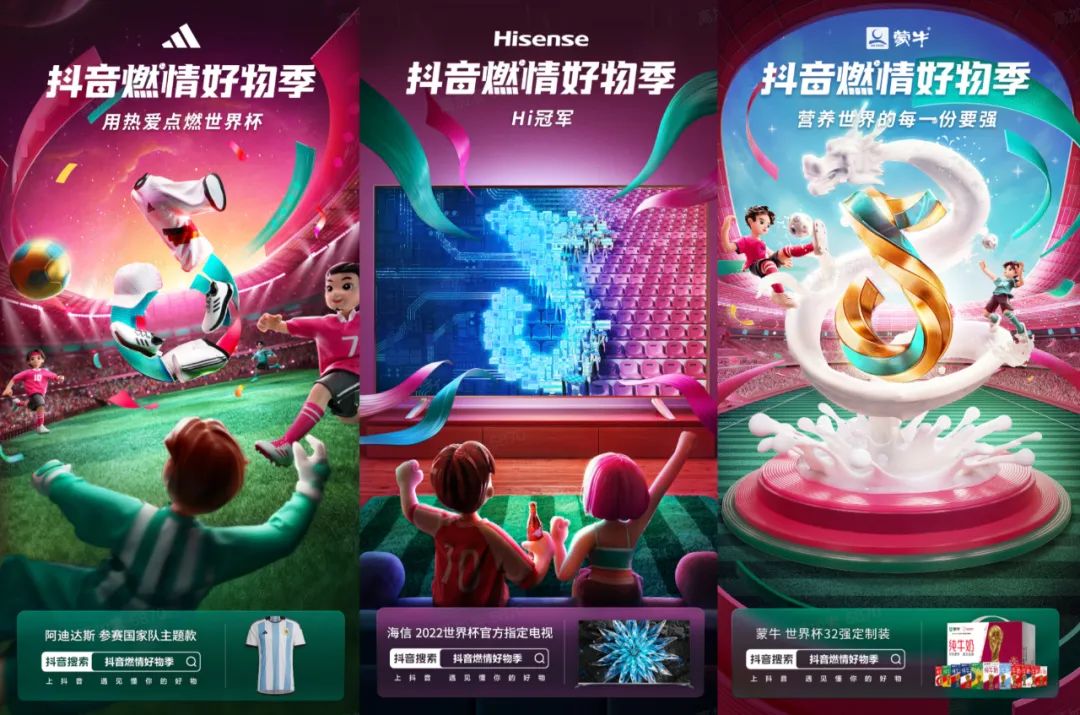 在关注场景体验的基础上,人们也更关注世界杯消费品的纪念意义和仪式感。为此,除了前文提及的卡塔尔世界杯官方授权纪念品外,抖音电商还联动了蒙牛、海信、可口可乐、阿迪达斯、百威、vivo这6大世界杯官方赞助品牌,在“抖音燃情好物季”会场专区推出了限定、联名款商品。蒙牛纯牛奶世界杯32强定制装、可口可乐世界杯限定迷你罐、阿迪达斯各国家队同款球衣等,均为消费者带来“参与世界杯”的仪式感和独属于这届世界杯的购物记忆。