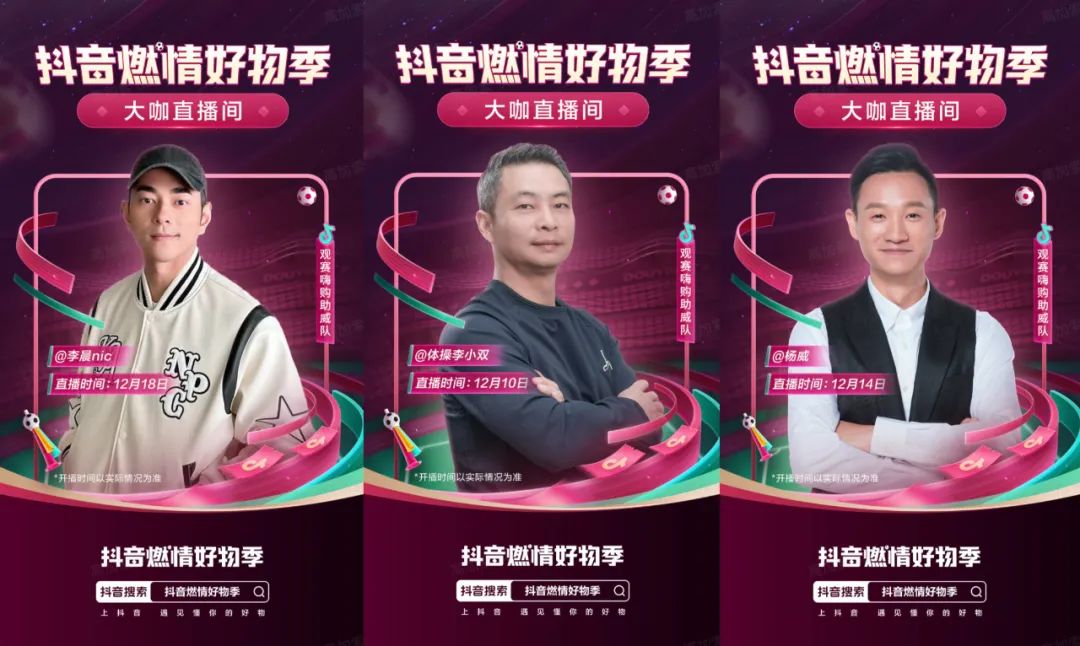 这一届消费者不仅对商品有需求,同样对消费体验有了更高诉求。配合世界杯赛事直播进程,抖音燃情好物季邀请来李晨nic、李小双、杨威运动体育大咖打造主题直播间,升级着“内容吸引-购买”的全程体验。
