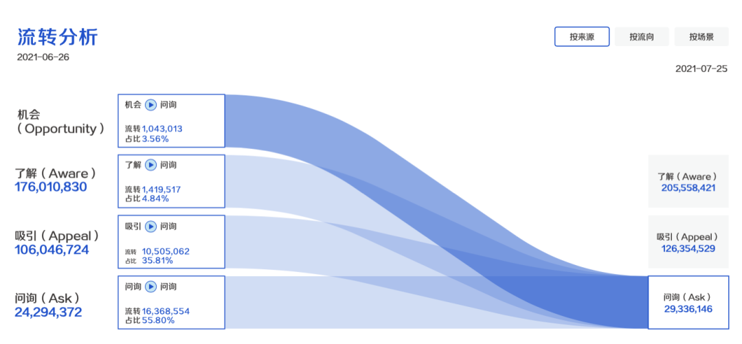 这一模型被巨量云图引申为O-5A品牌人群资产模型,将用户划分为O机会人群、A1了解人群、A2吸引人群、A3种草人群、A4行动(首购)人群和A5拥护(复购)人群五个层级。值得关注的是,巨量引擎通过收集和分析用户的内容行为、星图视频行为、品牌号行为、广告行为、搜索行为和购买行为等数据,经过反复验证,将5A人群进行了科学分层。也就是说,巨量引擎根据用户行为将其分别打上了从O、A1、A2、A3到A4和A5的标签,并且能够跟踪这些人群向下一层级的转化情况。