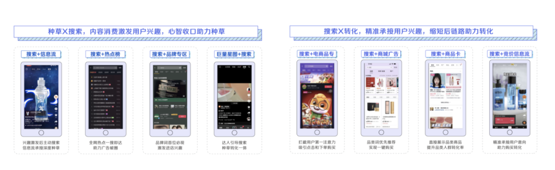 因此,企业需要匹配搜索广告、效果广告、直播间引流等形式,去承接A3人群的内容需求和转化需求,使种草和拔草之间的路径更为顺滑,不断链。抖音提供了多样化的搜索入口,支持用户边看边搜,同时通过搜索热榜、品牌专区、电商品、商城、商品、竞价广告等产品助推用户消费意愿,踢好销售转化的临门一脚,降低A3人群在后链路的流失率。