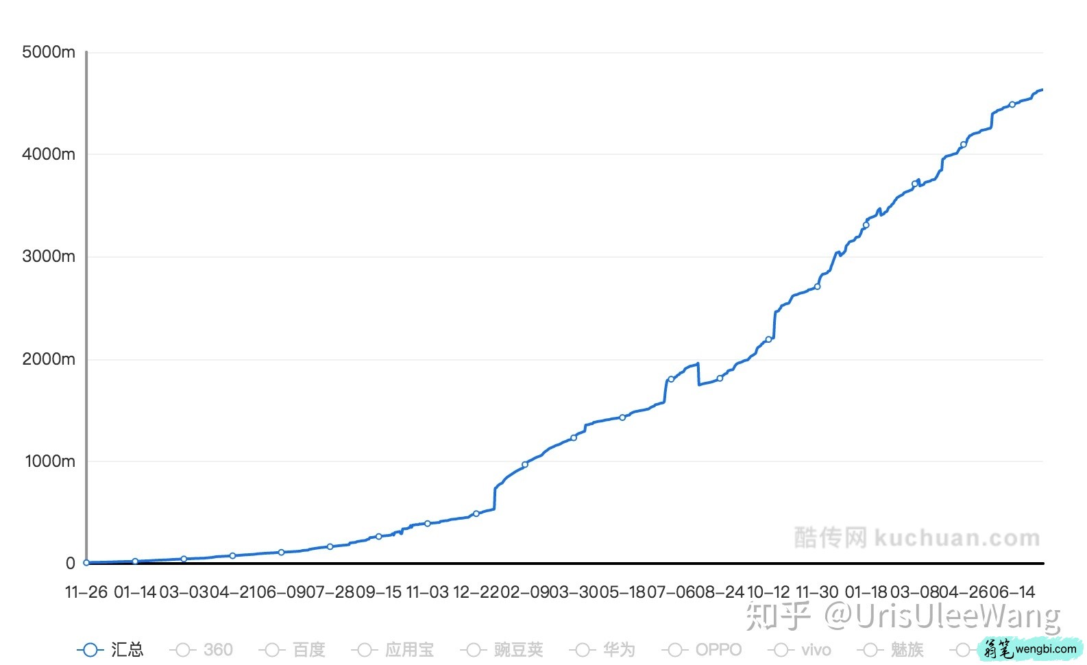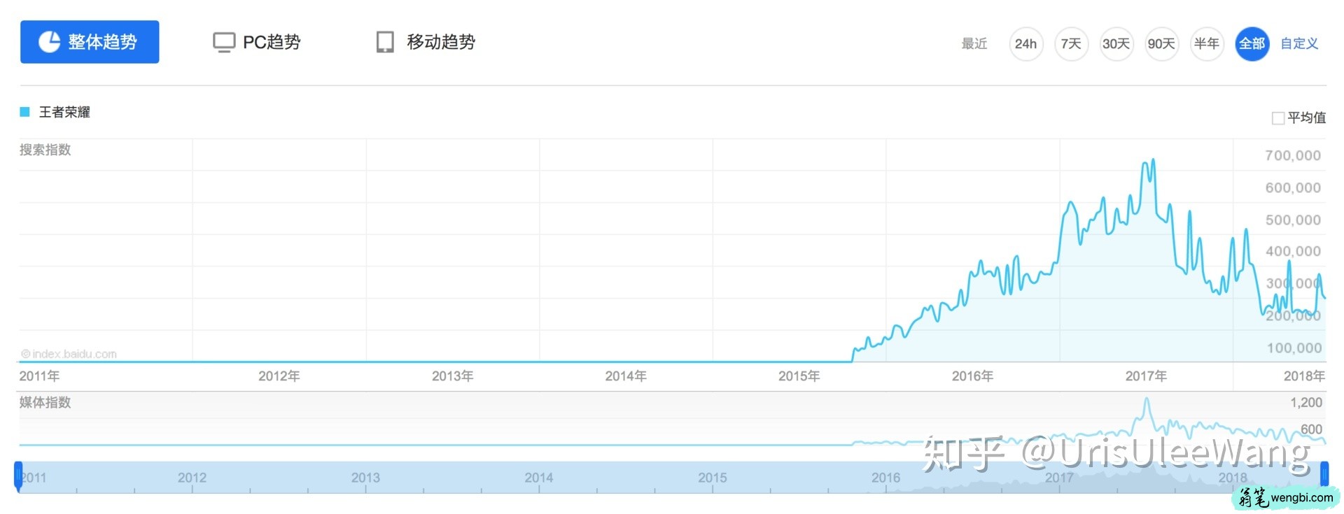 自2015年11月26日发行以来,王者荣耀的关注度和下载量都是节节攀升,一直呈上升趋势。每次的波峰波、波谷点都受到王者荣耀一路走来的几个重要里程碑事件影响。