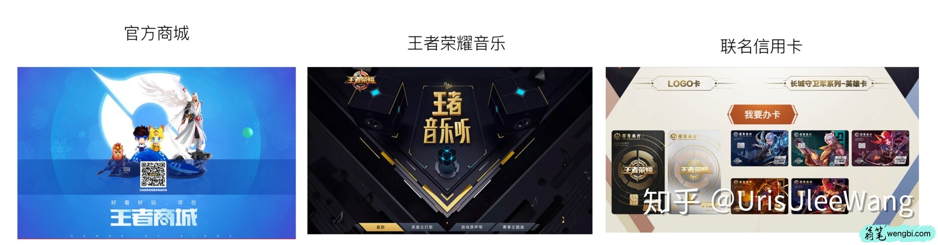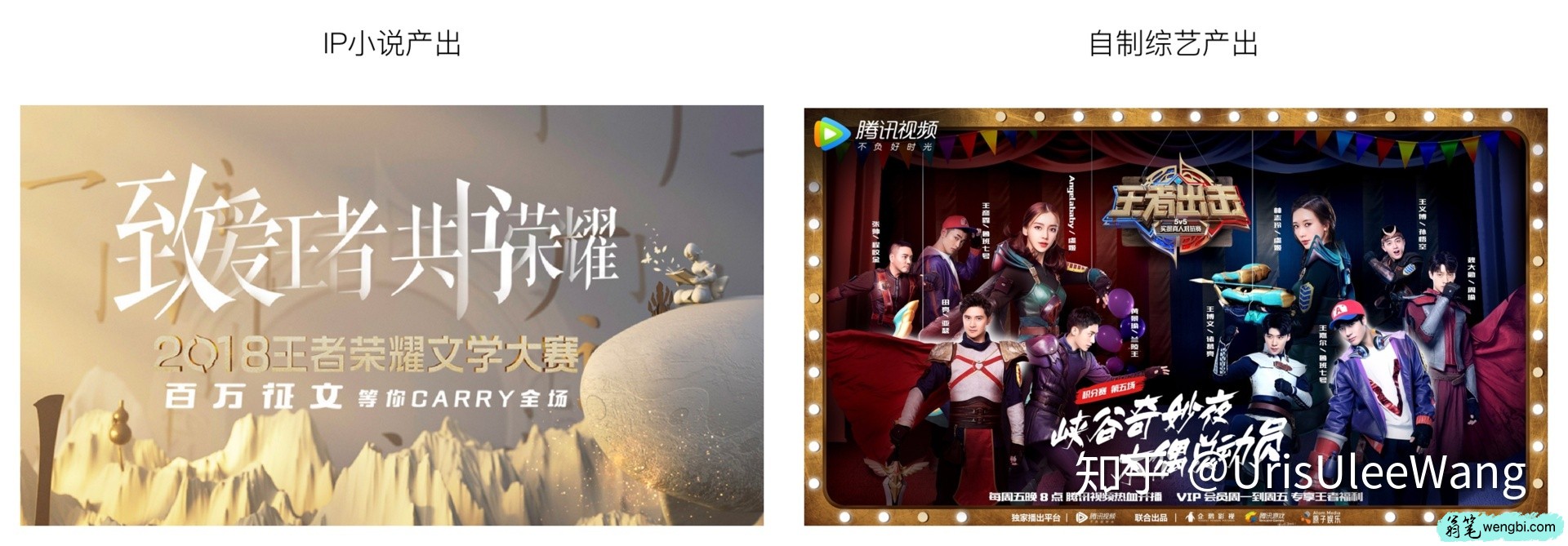 腾讯旗下阅文集团推出百万王者荣耀衍生IP小说大赛,以及腾讯推出的王者荣耀真人对抗赛自制综艺《王者出击》,利用明星效应又扩大了游戏知名度。同时实体周报商城、王者音乐、招商银行信用卡等,
