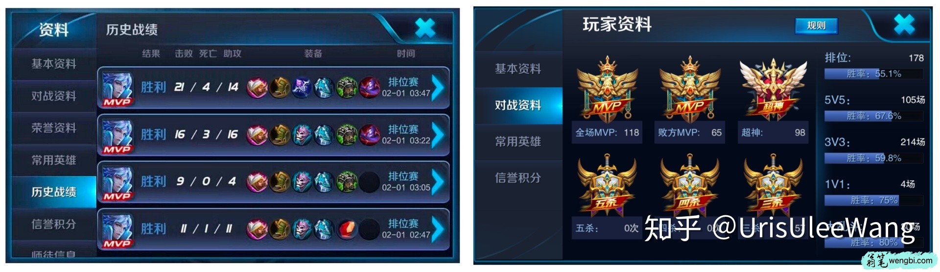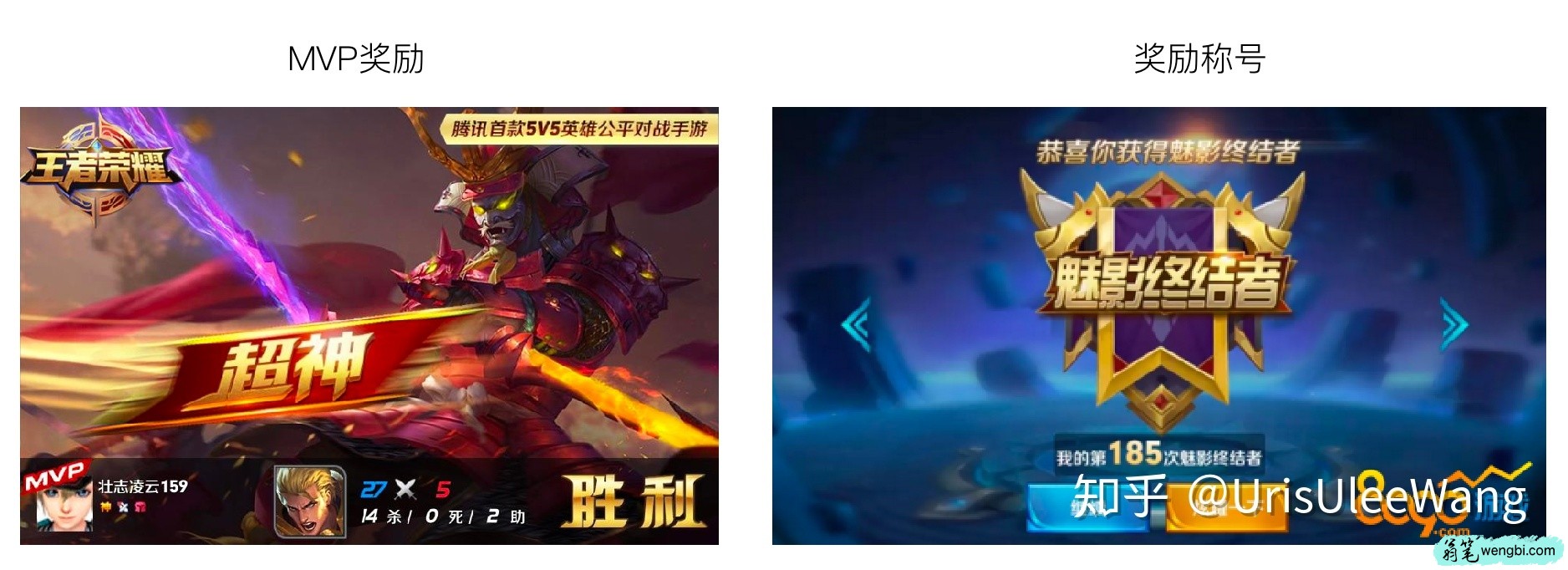 ② 游戏结束后反馈。一场游戏结束时,团队的胜负、用户在当局游戏中的表现,是否获得MVP,赛场数据和个人战绩,王者荣耀都提供了充足、成体系的荣誉称号,并支持用户分享到微信和QQ,可以满足用户渴望的荣誉感和虚荣感。