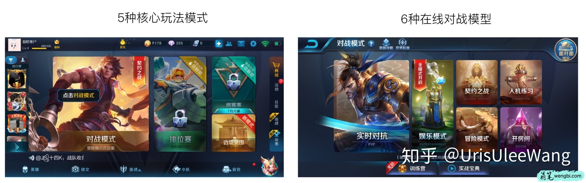② 练的时间投入:王者荣誉有着5大玩法,其中对战模式是玩家触发的最常涉及到的板块,因此产品设计中也提现了这种特性,对战模式中包含了6种在线对战模型+1种新手教学训练营+1种实战宝典学习。玩法丰富多样。将游戏角色要素 C 和要素 D 做得非常丰富,甚至直接支持了好友面对面玩的功能,达到了宣传的开黑标签。