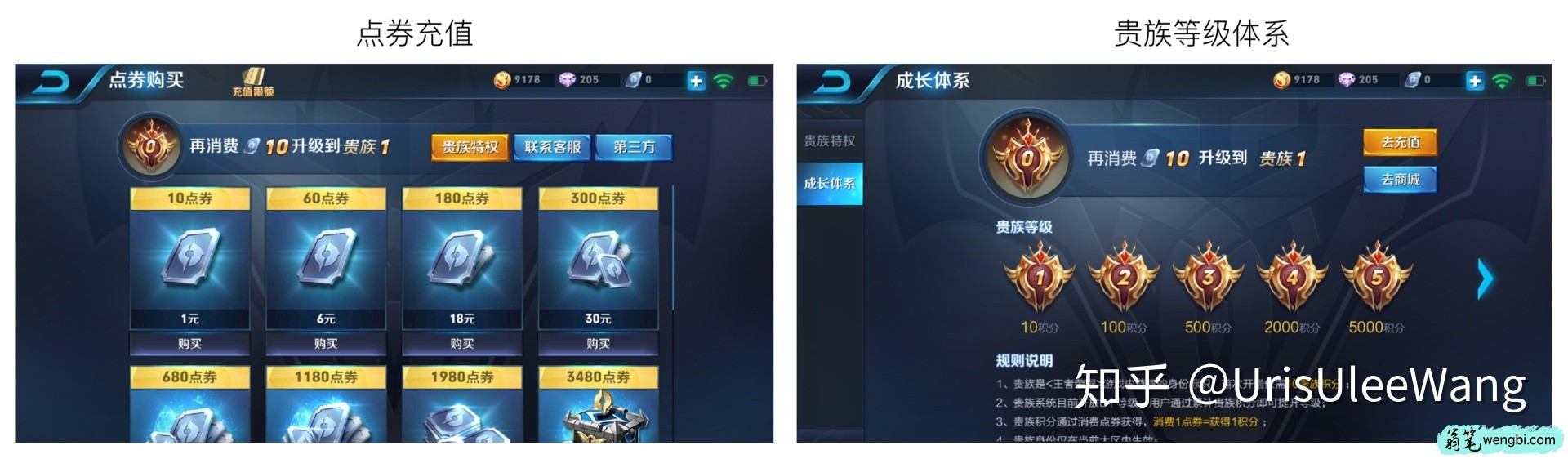 ② 消费长大体系。王者荣耀中有3种消费代币,包含金币、钻石、点券,其中用户充值点券,会累计相应的成为贵族,并不断升级。贵族等级的不断提升,用户又能获得一些贵族特权、免费贵族专享的华丽皮肤。这也基于要素 A,不断满足用户对于自身身份特殊性的优越感。