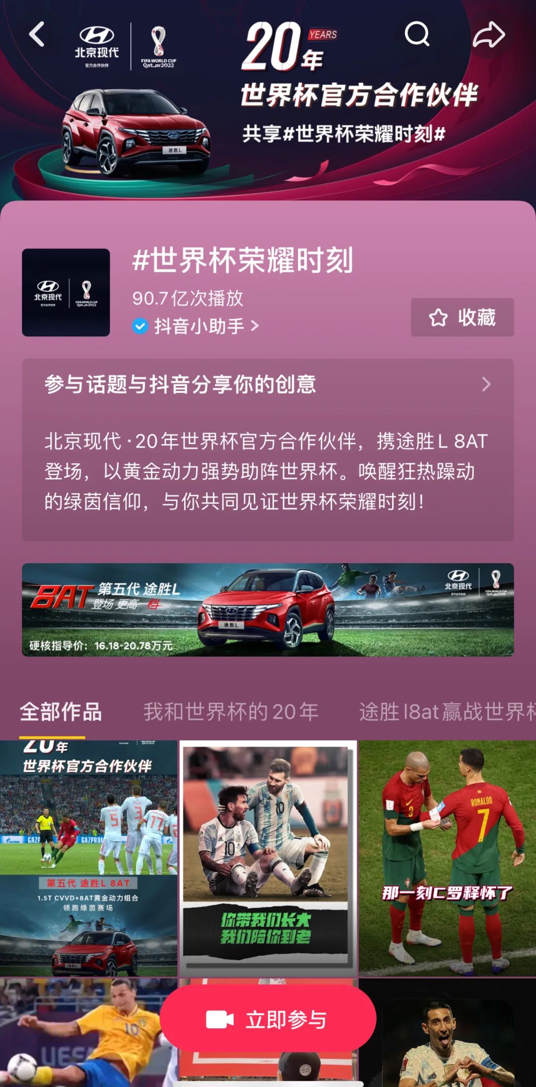 在抖音世界杯期间,北京现代除了官方#世界杯荣耀时刻话题之外,还开设了两个子话题挑战赛和全民任务,以#我和世界杯的20年和#途胜l8at赢战世界杯,联动#世界杯荣耀时刻官方话题,持续激发品牌互动。在其中,品牌还邀请刘畊宏带领第五代途胜L 8AT登场卡塔尔世界杯现场,与官方企业号内容联动,为品牌持续加热。