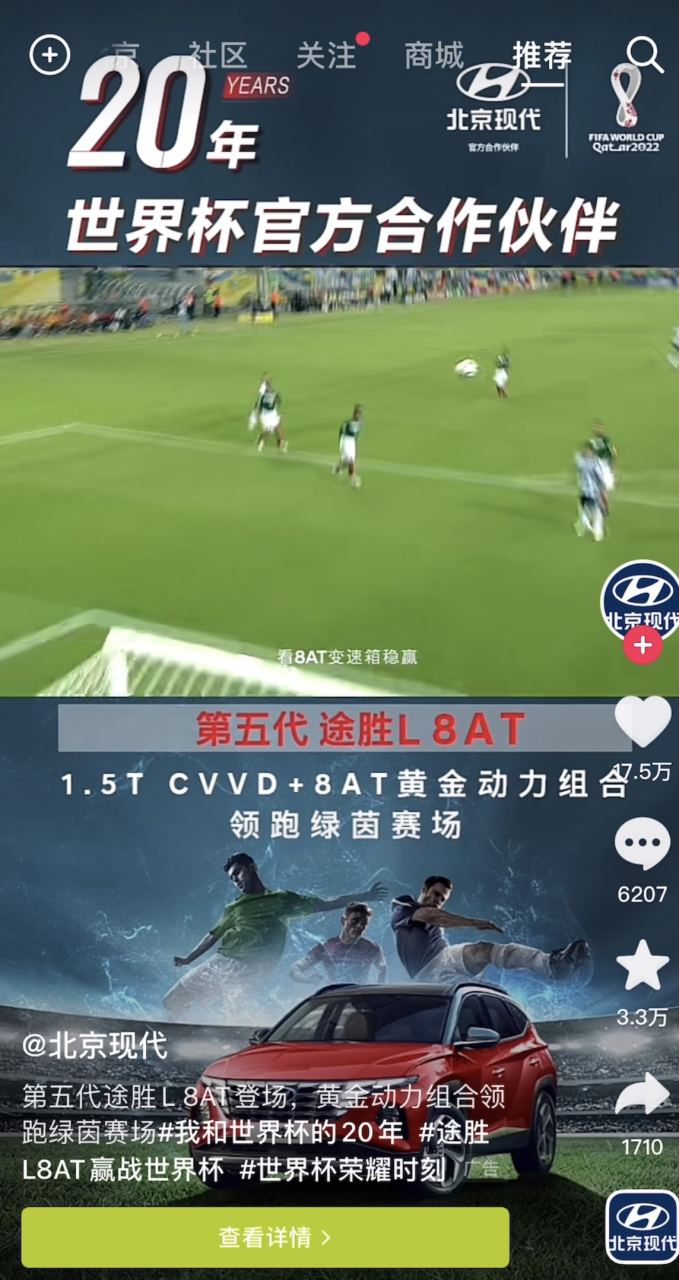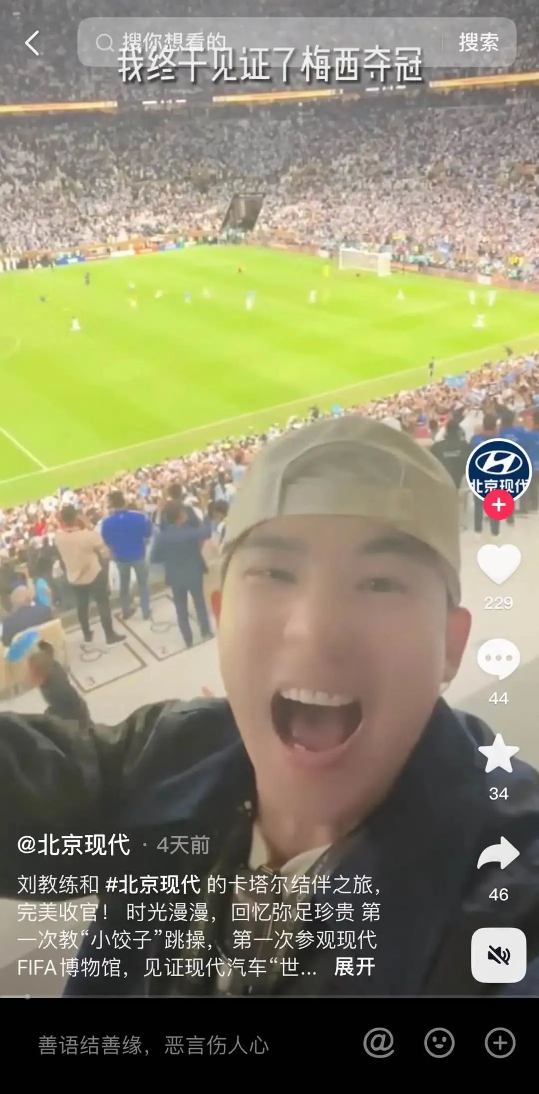 然而,不仅是把品牌送到世界杯绿茵场上,北京现代与新手抖音也共创了一段赛事之外的营销新佳话。今年,抖音集团获得2022卡塔尔世界杯版权,作为2022世界杯持权转播商、中央广播电视总台2022世界杯官方直播合作伙伴,巨量引擎也基于赛事提供了多样的营销方案,这也让一众品牌争先恐后入局,北京现代正是如此,往前与世界杯实时接轨,在后借助巨量引擎与球迷、观众共忆世界杯故事,借助抖音以轻快战略入局,重塑品牌世界杯新热度。