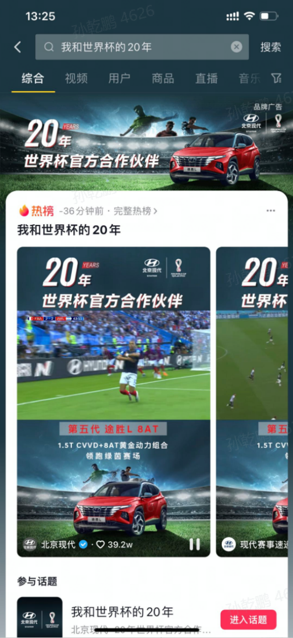 同时,在此话题页下,北京现代品牌的内容被置顶呈现。据巨量引擎官方数据显示,北京现代此话题目前已经超90亿总播放量,45.5万话题投稿数,从而累计收获视频分享量900万,参与创作者数14.5万。由此也为品牌持续聚合影响力,在与世界杯热度高度捆绑下,沉淀更多品牌私域用户,塑造用户对品牌的正向认知,更释放长效品牌价值。