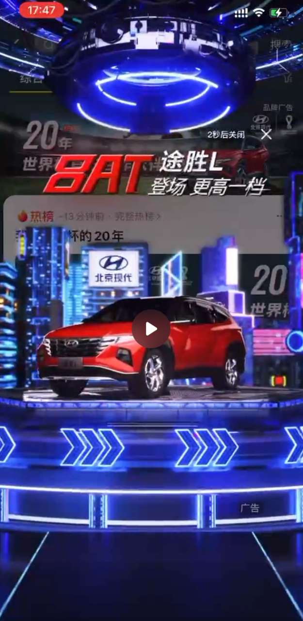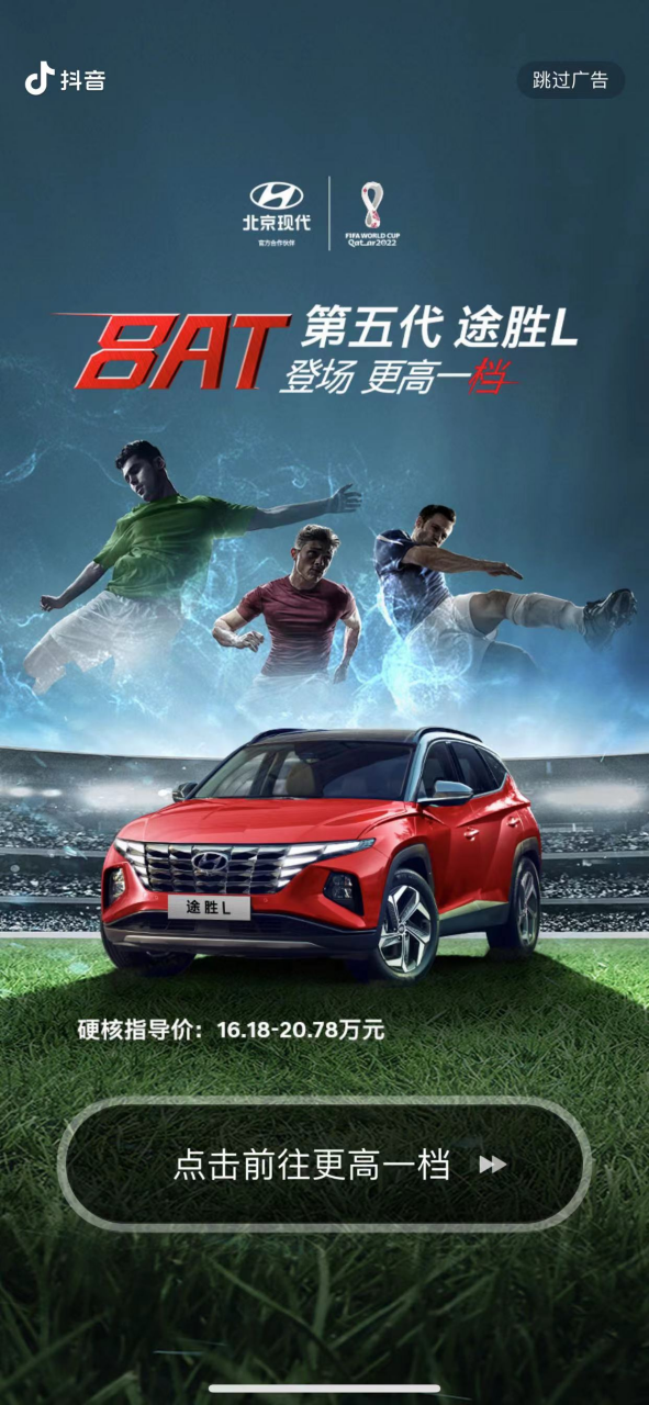 为此,在世界杯期间,北京现代第五代途胜L 8AT强势登场,通过聚焦第五代途胜L 8AT新款车型“黄金动力组合”价值点,采用系列创新广告样式,以精准化人群策略高效触达,实现品牌以及新车型的种草转化。