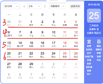 我们在 2012年02月26号选择时间范围为“最近6周”,一周周期默认为“周一至周日”,最近六周选择如下:
