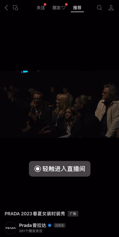 奢侈品在大众传播环境中很少有高光时刻,即便是每年的大秀,能够直接吸引的只是小众人群的关注,很难辐射到大众圈层。但是在腾讯生态的优质资源以及外部社交媒体的流量的饱和式曝光下,这个原本小众的话题也会在短时间内迅速爆发。作为行业内首个使用视频号合约信息流的奢侈品品牌,PRADA在2023春夏女装时装秀直播当天,通过微信视频号信息流广告引流大秀视频号直播间,成功实现短时大曝光。朋友圈广告、微信搜一搜品牌专区等触点均可在大秀当天帮助用户一键进入大秀直播间,在加上沉浸式的直播形式,实现了声量和体验上的互补与协同。