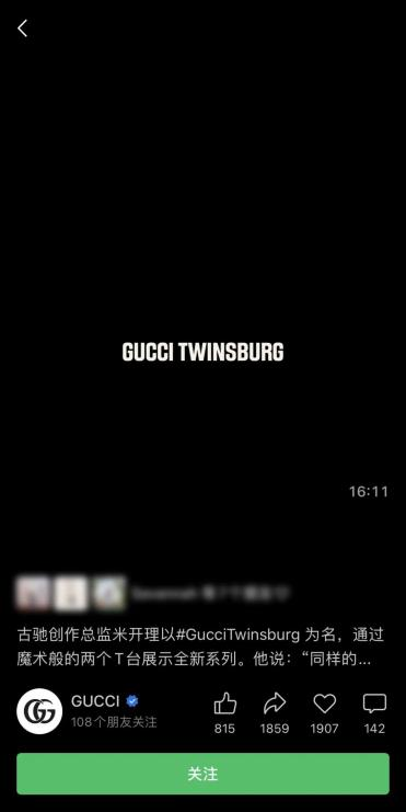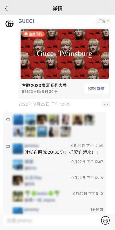 就拿把2023春夏系列大秀搬到腾讯生态的GUCCI来说,品牌不但通过投放朋友圈广告轻松吸引用户点击并一键预约视频号直播,实现向直播阵地的高效引流。也在官方的视频号、公众号等私域阵地发布预热内容,帮助品牌快速捕捉流量预热大秀直播。与其同时,腾讯也结合消费者的日常浏览习惯,将多个曝光位串联成强大的预热阵地。