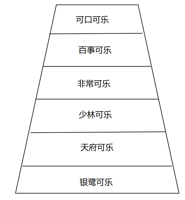 毫无疑问可口可乐处在第一个阶梯,然后是百事可乐。其余的品牌统统都消失了,因为心智容量有限,无法储存太多的同类产品。