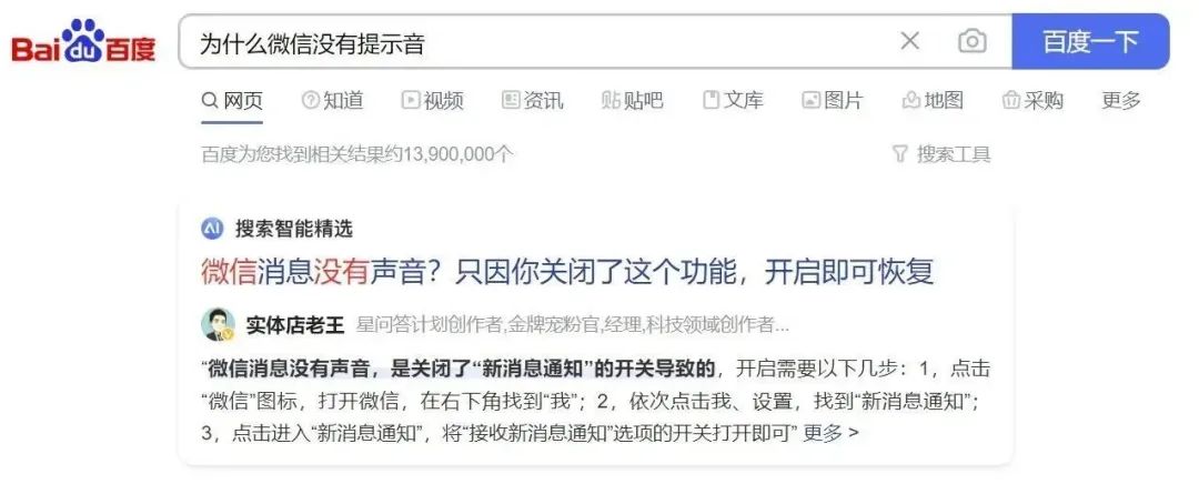 如果问题问的是原因,我们直接在摘要中直接说明原因,比如下面这个例子“为什么微信没有提示音”,把详情页中提到的具体原因提炼出来,并且清晰地表述出来就好。