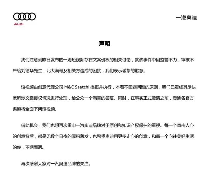 5月23日,奥迪在上午10点左右,先是撤下了官方视频号的内容,并在10点13分在官方微博发出声明。道歉+下线+甩锅(给4A公司),基本符合大叔的预判。