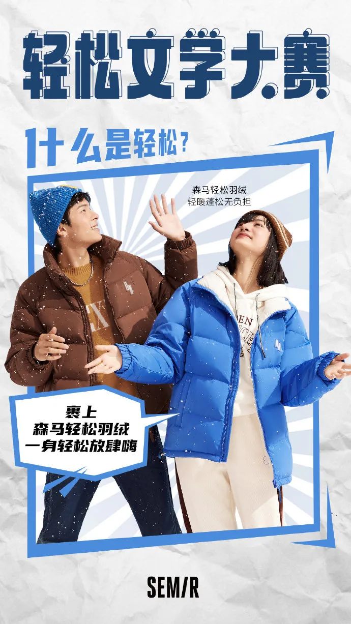 六爷注意到,森马近期就推出满足年轻人减负需求的“森马轻松羽绒”,携手自带轻松感的世界冠军任子威玩出一场轻松又治愈的营销互动,在年轻化的道路上再进一步。