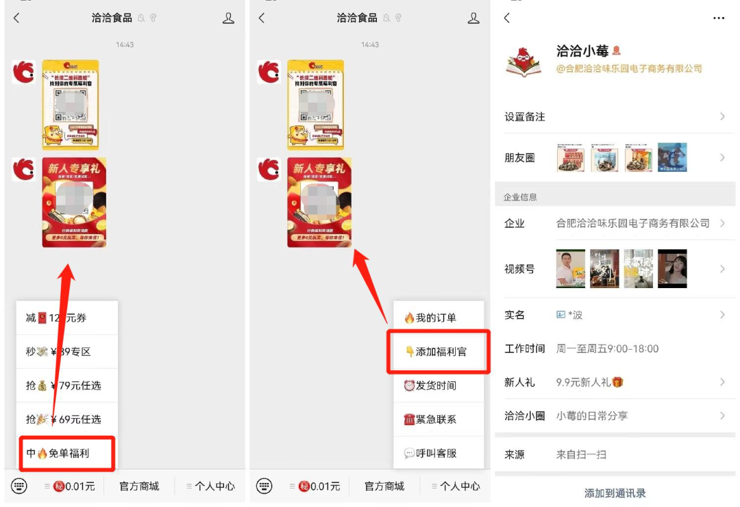 点击菜单栏【0.01元】中的【中免单福利】,或点击菜单栏【个人中心】中的【添加福利官】,自动跳转出企微添加页面,由企微邀请加入社群。
