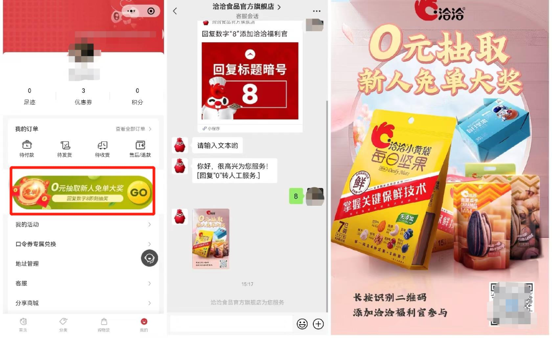 在商城个人中心,用【0元抽免单大奖】福利吸引用户,点击进入后,会跳转到在线客服对话框,在对话框右下角会有提示回复关键数字“8”,回复后会自动跳出福利官【小核桃】企微海报,添加后即可入群。