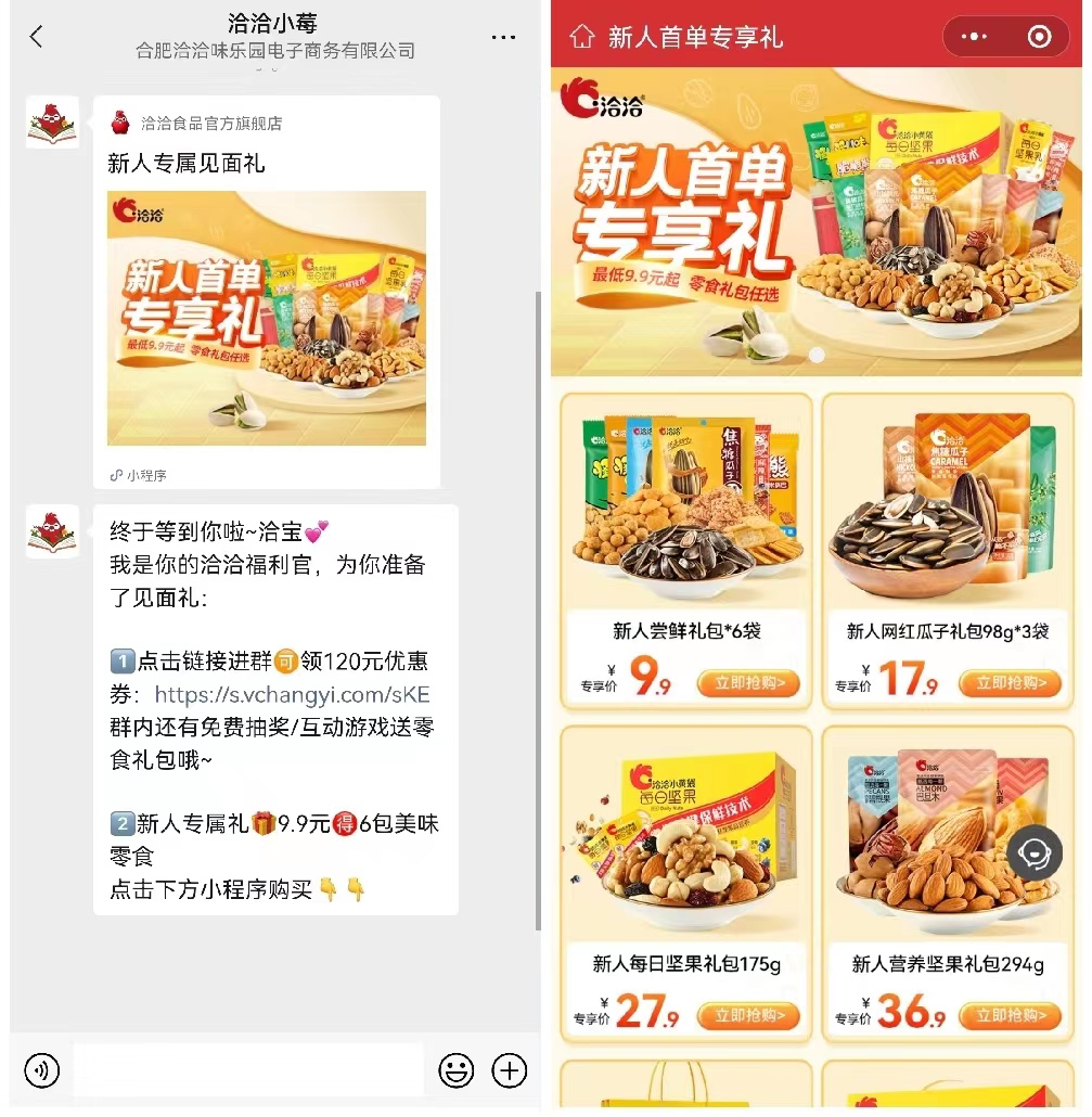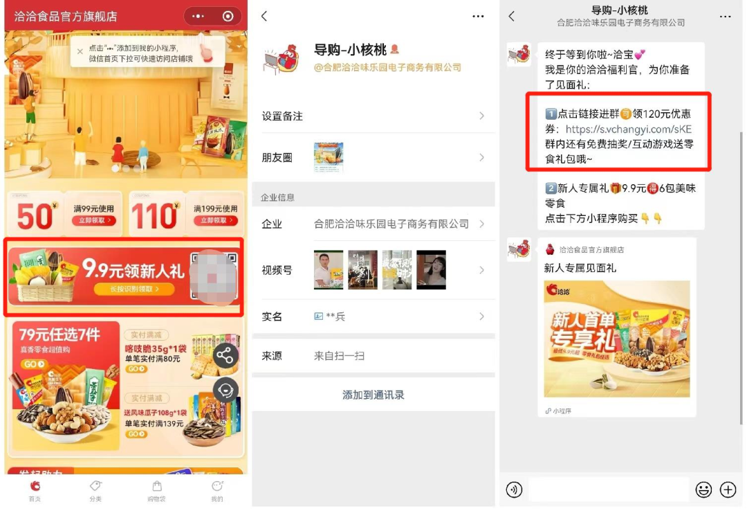 在【洽洽食品旗舰店】的首页,利用【9.9元领新人礼】的福利吸引用户点击,长按即可扫码添加企微【导购-小核桃】。添加成功,企微自动发送邀群二维码。