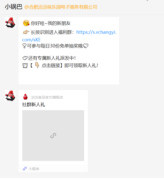 洽洽食品不同渠道添加的IP不同,主要是【洽洽小莓】和【小锅巴】,运营动作基本一致,下面以我添加的企微【洽洽小莓】为例进行拆解: