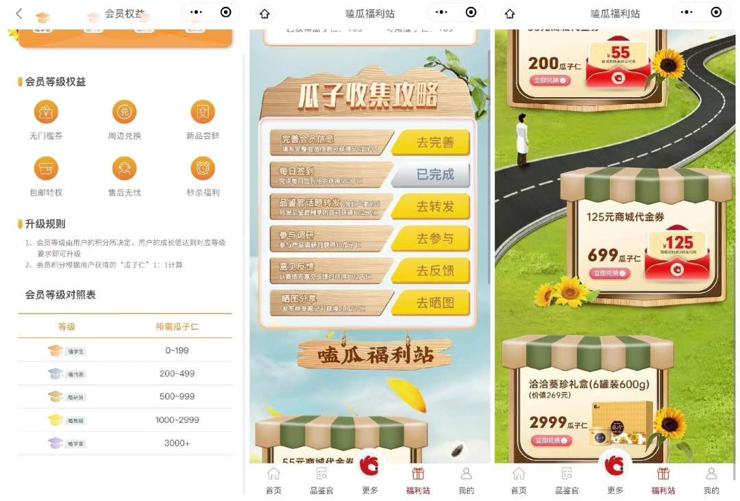 积分被称为“瓜子仁”,通过完成指定任务可以获得大量“瓜子仁”,用于等级成长、优惠换购及产品兑换。