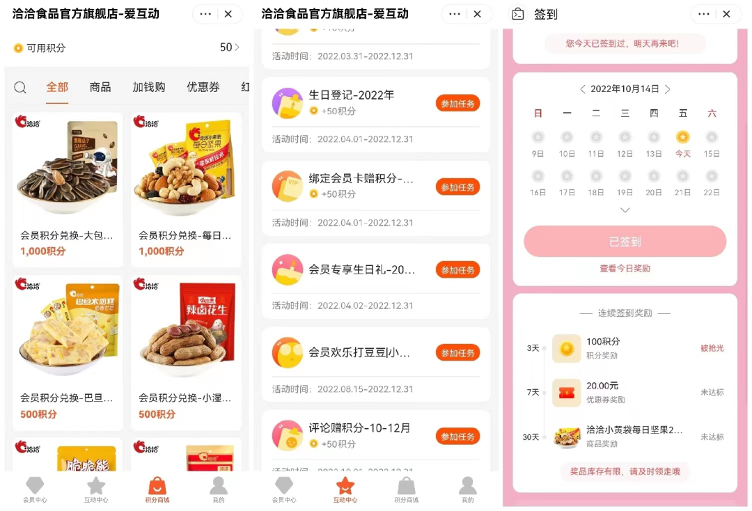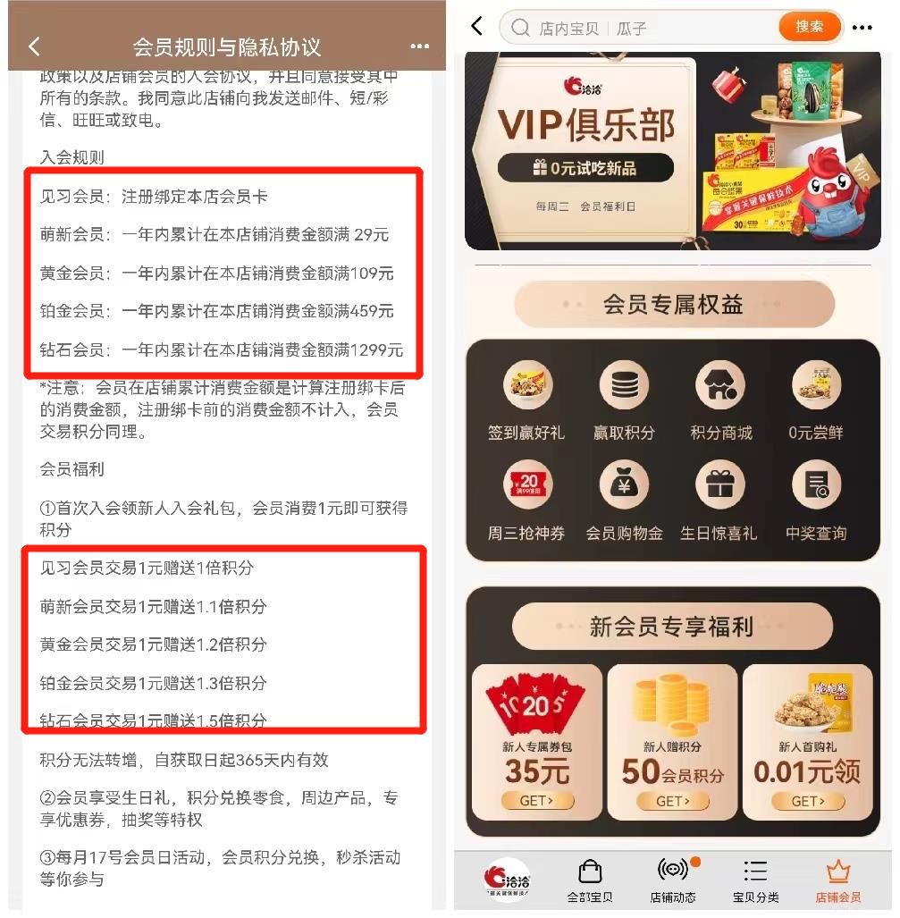 洽洽在微信小程序和电商平台中设置了会员体系,两者都是会员体系+积分体系,福利的内容略微会有不同。