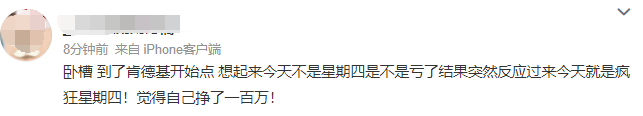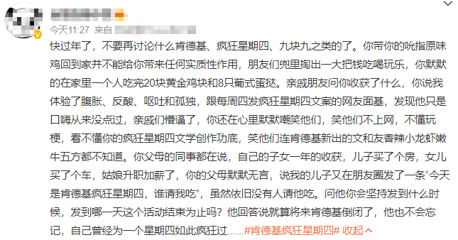 这样一来,每周四就成为了消费人群上班时间中释放压力、情绪的日子,年轻人可以通过玩梗来满足自己内心的情感期待,随着参与的人数增加,无形中提升了肯德基每周促销的热度。