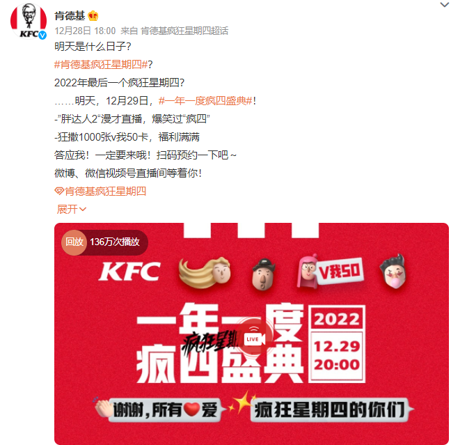 甚至为了为活动造势,肯德基还选择在年终上线“一年一度疯四盛典”,并总结了活动中的热门词汇,如V我50、谁请我吃、富家千金为什么总在疯狂星期四吃肯德基等,来形成消费者的对肯德基疯狂星期四的整体印象。