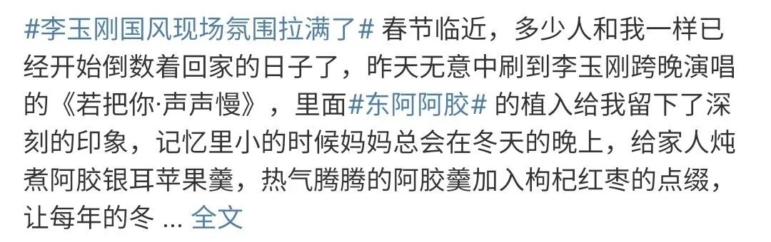 晚会上线前,品牌便联动KOL跨年预热,提前为网友解锁跨年关键词,晚会当日,东阿阿胶以“新年守护官”的身份出现在江苏卫视2023跨年演唱会上,同时携手李玉刚老师、新生代国风歌手刘瑾睿,在B站跨年晚会共献一曲《若把你·声声慢》,以跨年晚会参与者视角,扩散话题讨论,让线上的粉丝们也可以感受到浓烈的现场气氛,参与到跨年狂欢中。