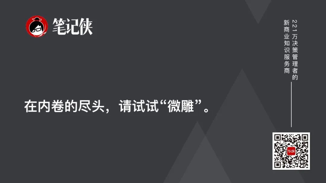 9.在内卷的尽头,请试试“微雕”:内卷是低水平的复杂化,是你用这招,我也用这招,大家互相耗着。但微雕,是总能找到下刀的新角度,它们不在同一个作业面上。