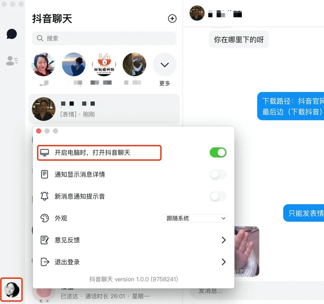 勾选该选项后,用户打开电脑后,抖音聊天和微信一样,有了同等被用户选择的权利。至于用户会不会选择用抖音聊天,则取决于抖音好友彼此之间的聊天习惯以及彼此的在线时间。