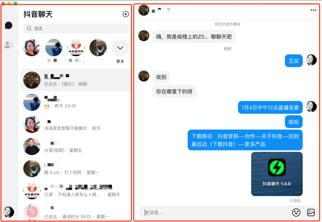 现有版本中,用户登陆后即可和好友聊天以及发起群聊,目前该界面比较简单。如下图显示,左侧为聊天和好友列表,中间为好友栏,右侧为具体聊天界面。目前只提供了聊天功能,并没有语音和视频等功能,但可以同步手机端的抖音APP聊天对话和记录。