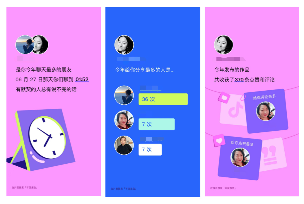 而抖音尝试社交的努力一直未曾停歇。几天前抖音发布了一个小功能,支持用户生成自己的2022年度报告,其中可见今年与自己聊天最晚的朋友,给自己分享最多的朋友,给自己点赞和评论最多的朋友,以及在抖音上认识的第一个朋友等。这些细节设计,都可以看出抖音在社交上正不断塑造和加强用户心智。
