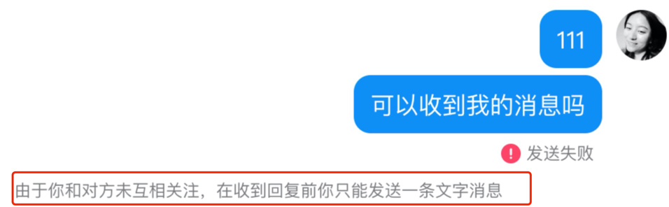 见实测试,如果通过搜索名字想和某个陌生人沟通,则只能发送一条消息。并且提示“由于你和对方未互相关注,在收到回复前你只能发送一条文字消息”。