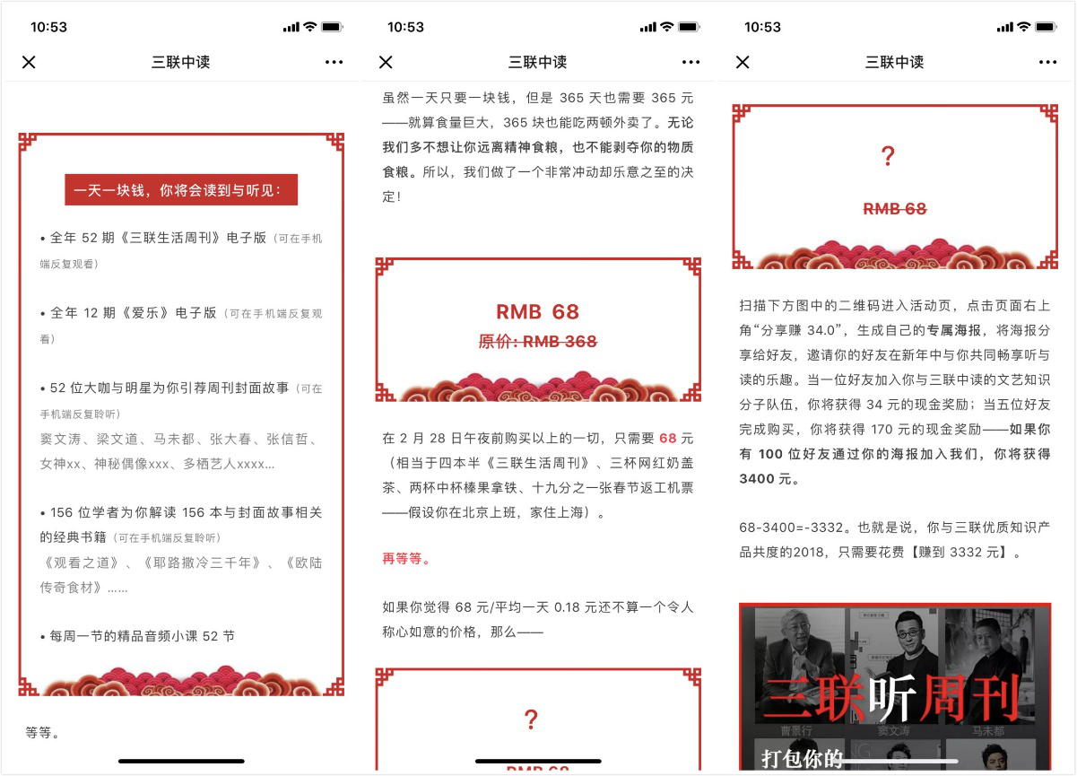 可以学习一下三联中读的做法。它就在裂变活动中灵活运用了“价格锚点”这一心理规律,从而实现了病毒式的爆发和增长。