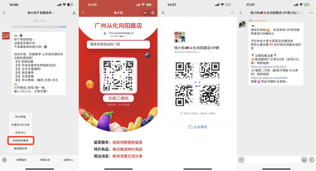 在公众号「钱大妈不卖隔夜肉」的菜单栏中的「扫码领优惠券」,系统会根据当前定位自动匹配附近线下门店二维码,点击识别即可跳出社群二维码,长按二维码会自动加入社群。