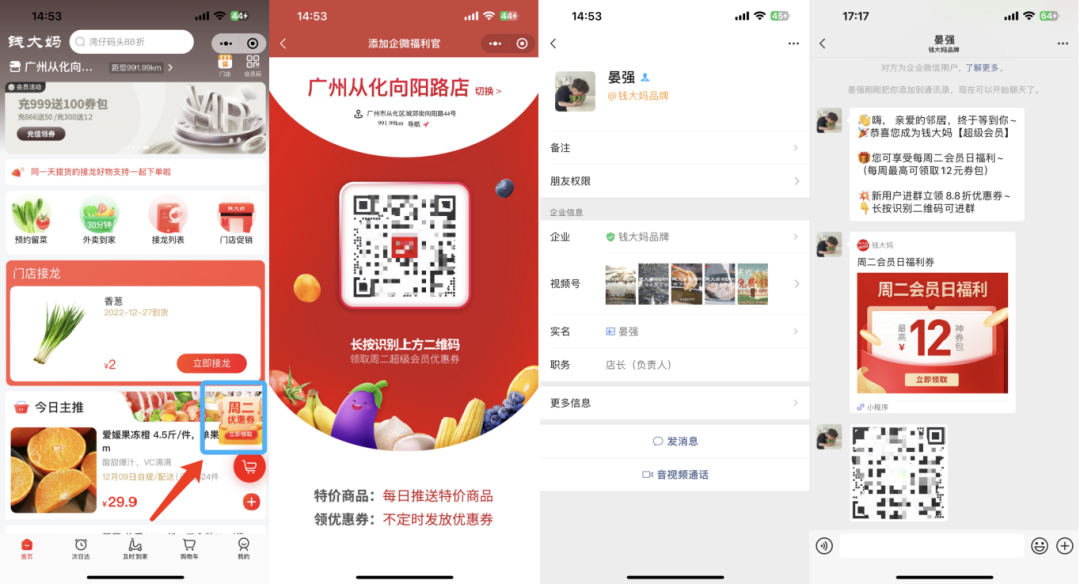 引流路径1:在首页,利用「周二优惠券」的福利吸引用户点击,点击后根据定位跳转到附近线下店铺,长按即可扫码添加对应门店店长企微。添加成功,企微自动发送社群二维码。