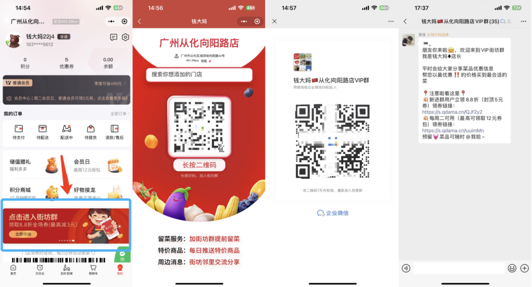 引流路径2:在商城个人中心,底部有循环banner图,点击「点击进入街坊群」,根据定位会跳转到附近线下店铺,点击识别即可跳出社群二维码,长按二维码会自动加入社群。