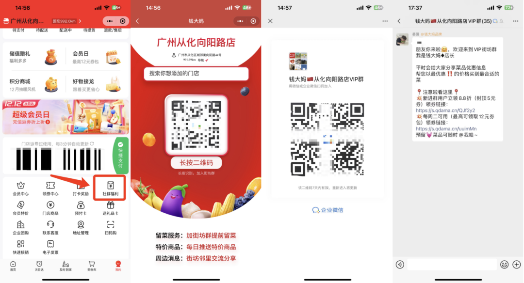 引流路径3:在商城个人中心底部有「社群福利」,点击后系统会根据定位跳转到附近线下店铺,点击识别即可跳出社群二维码,长按二维码会自动加入社群。